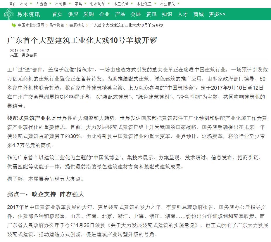 木材圈網發布有關2017中國筑博會·廣州開幕式的報道 (2017-10-30)