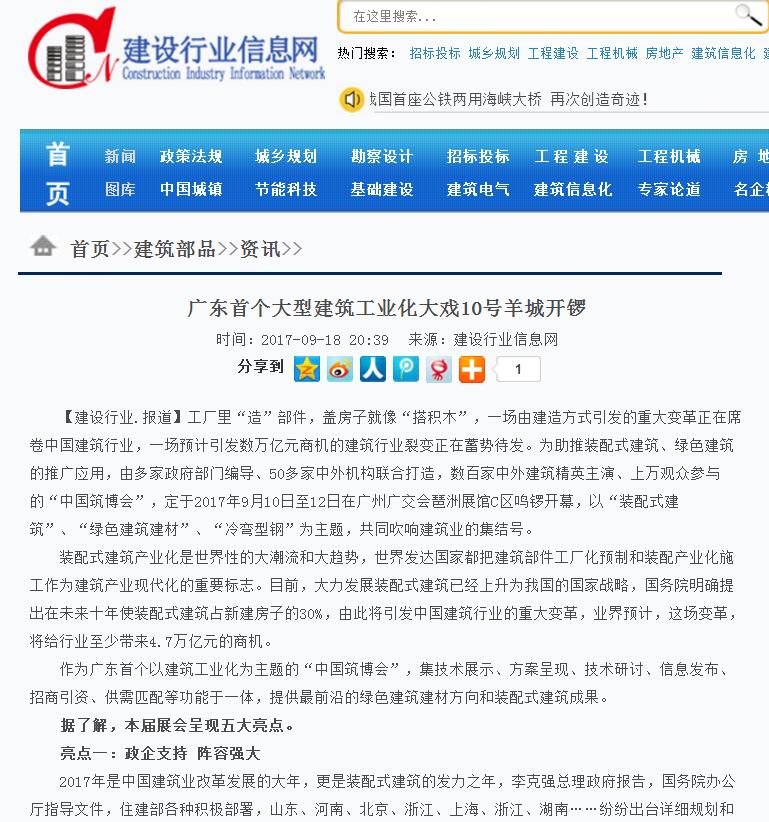 筑龍網發布有關2017中國筑博會·廣州開幕式的報道 (2017-10-30)