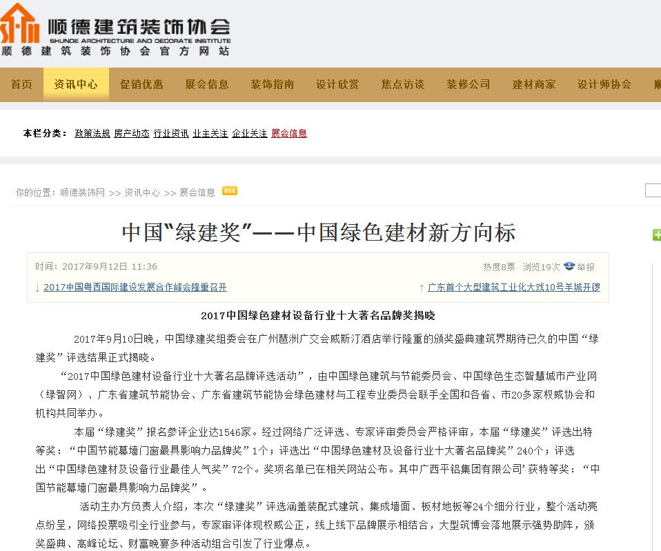 鋁博士網發布有關2017中國綠色建材設備行業十大著名品牌獎的報道 (2017-10-31)