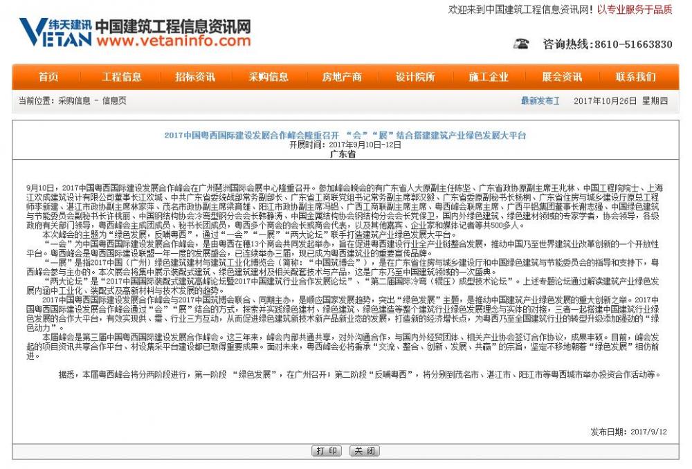 中華整木網發布有關2017中國粵西國際建設發展合作峰會的報道 (2017-10-31)