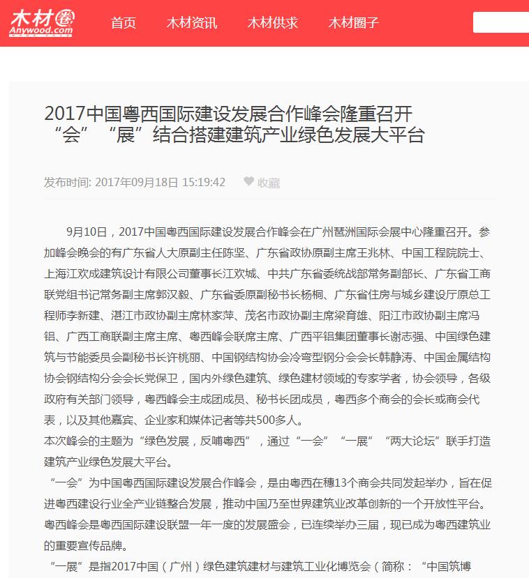 中華整木網發布有關2017中國粵西國際建設發展合作峰會的報道 (2017-10-31)