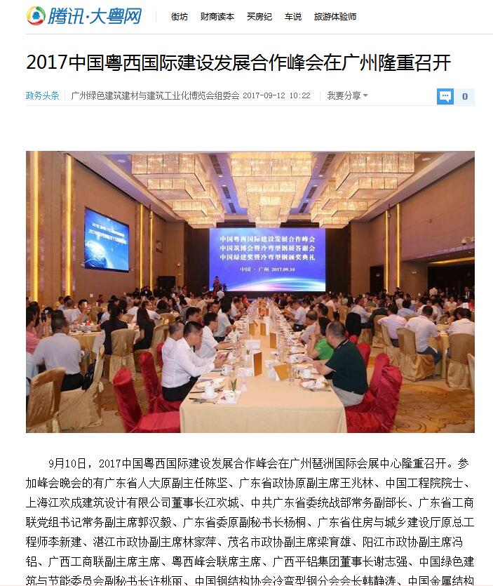 騰訊·大粵網發布有關2017中國綠色建材設備行業十大著名品牌獎的報道 (2017-11-01)