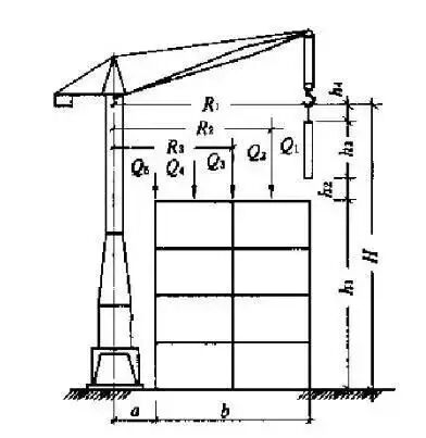 選擇時,首先應分析結構情況,繪出剖面圖,并在圖上注明各種主要構件的重量Q,及吊裝時所需的起重半徑R;然后根據起重機械性能,驗算其起重量、起重高度和起重半徑是否滿足要求,如圖所示。