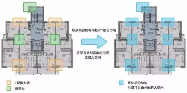 ▲ 優(yōu)化剪力墻結(jié)構(gòu)設計,取消了框架柱,使得戶型擁有大跨度空間